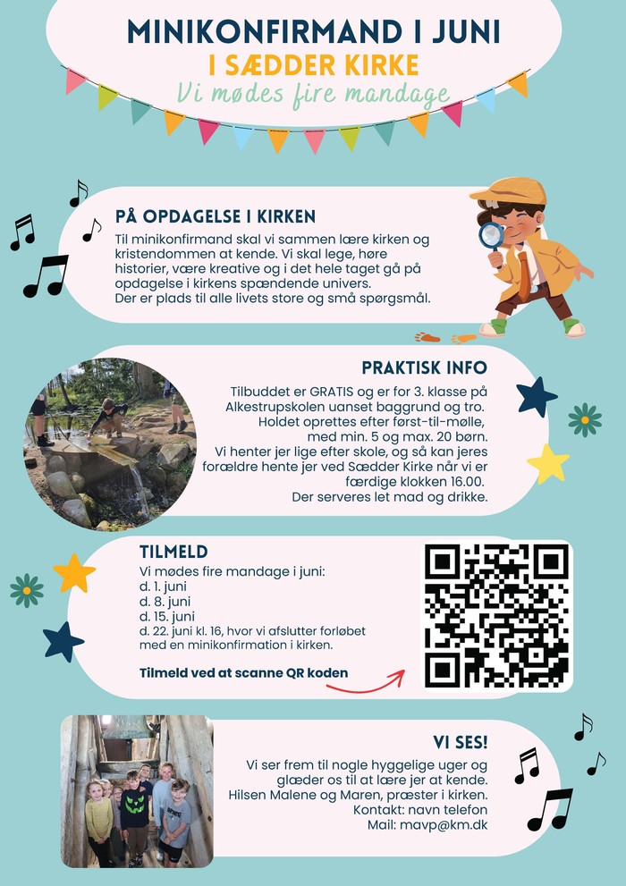 Sognepræster Malene Flensborg og Maren Pitter Poulsen er klar med et forløb over 4 mandage i juni for alle 3. klasses børn på Alkestrupskolen. Se nedenstående invitation, som også er uddelt på skolen.